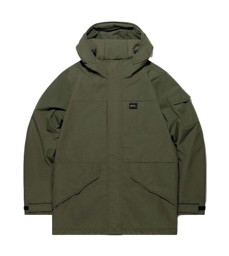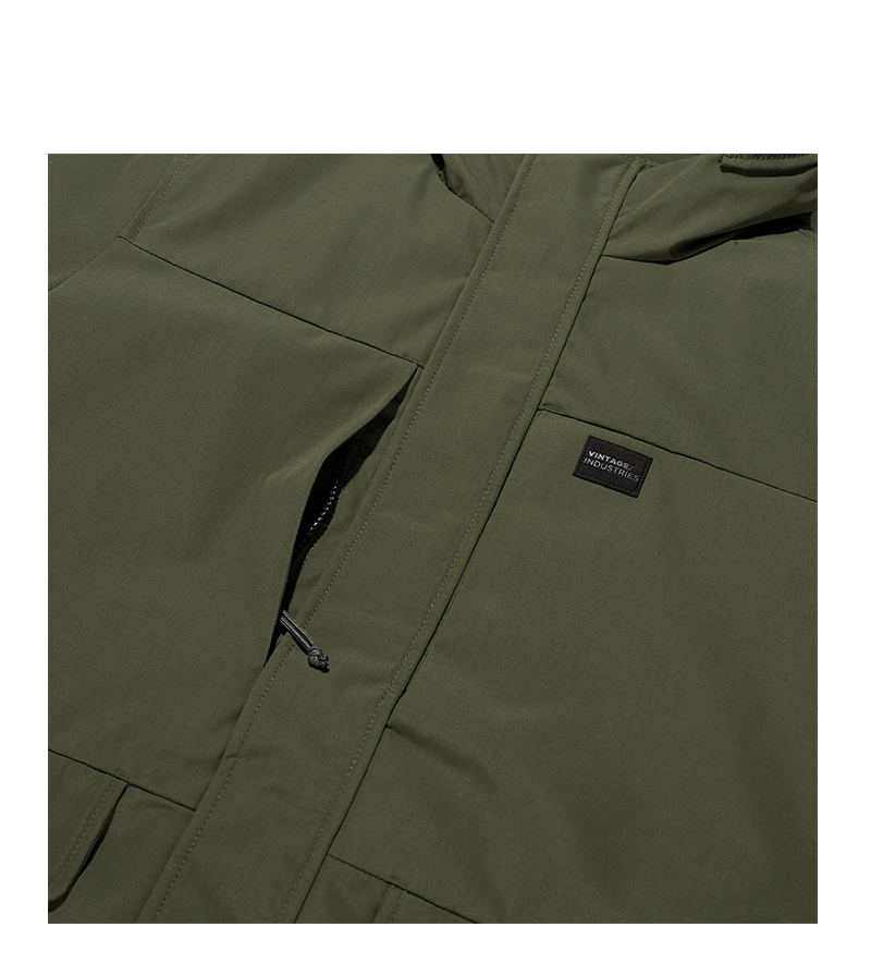 100% polyester ripstop, 100% polyester lining, global recycled padding, GRS, waterproof 5000mm/H2O, breathable 3000g/M2, US military model, chest and front pockets